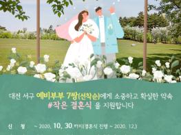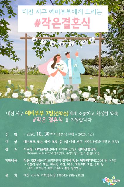 대전 서구(구청장 장종태)는 절차와 규모는 소박하지만 결혼의 진정한 의미를 깨닫는 “사랑의 결실, 작은 결혼식” 참여자 모집 기간을 다음 달 30일까지 연장한다고 9일 밝혔다.