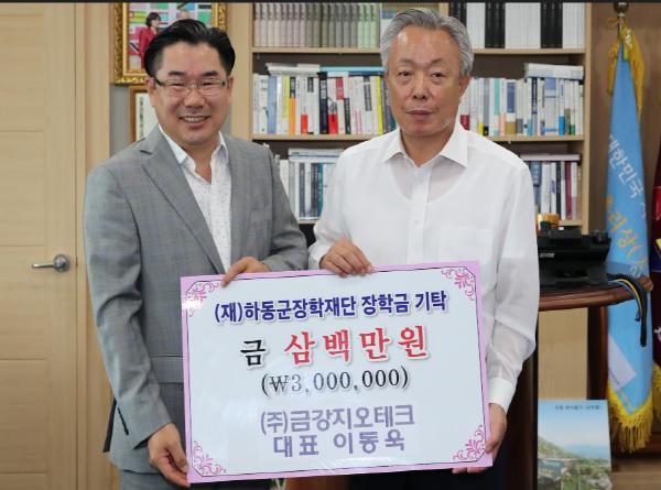 (재)하동군장학재단(이사장 이양호)은 창원 소재 (주)금강지오테크 이동욱 대표가 지난 8일 군수 집무실을 찾아 지역 청소년의 학업정진에 써달라며 장학기금 300만원을 기탁했다고 9일 밝혔다.