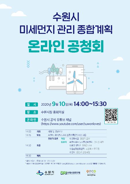 ‘수원시 미세먼지 관리 종합계획(2021~2025년)’을 수립하기 위한 온라인 공청회가 오는 10일 오후 2시 유튜브 채널을 통해 생중계된다.