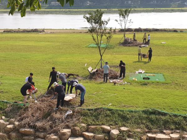 경주시 문화관광국 공무원 100여 명은 8일 오전 제10호 태풍 ‘하이선’ 으로 인한 침수로 나뭇가지 및 각종 쓰레기가 적치되어 있는 서천둔치 체육공원과 현재 조성중인 형산강파크골프장 등 주변 일대에서 긴급히 환경정비 작업을 실시했다.