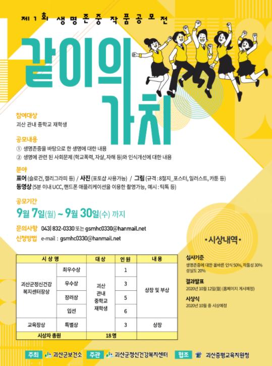 군은 괴산군 청소년들 사이에 생명존중문화를 확산시키고, 타인에 대한 배려와 더불어 살아가는 사회의 중요성을 알려, 학교폭력, 자살, 자해 등의 청소년문제를 예방하기 위해 생명존중 작품공모전을 마련했다.