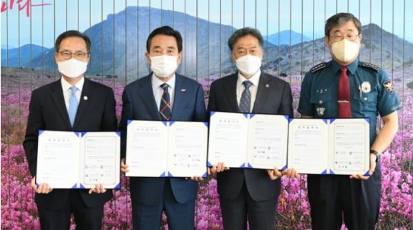대구 달성군(군수 김문오)은 8일 군청 군수실에서 달성교육지원청(교육장 조성철), 달성경찰서(서장 안정민), 계명대학교 대구경북사회혁신지원단(단장 하영석)과「디자인으로 안전한 달성 만들기」를 위한 업무협약을 체결했다.