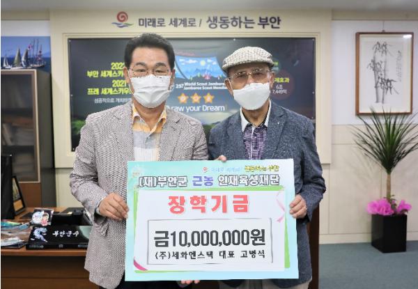 부안 출신으로 매년 지역인재 양성에 앞장서고 있는 (주)세화엔스텍 고병석 대표가 코로나19 위기로 어려운 경제상황에도 불구하고 9일 부안군 근농인재육성재단을 방문해 장학금 1000만원을 기탁해 꾸준한 고향사랑을 실천해오고 있다.