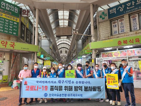대구 서구청(구청장 류한국)은 자유총연맹 서구지회(지회장 황영준)와 함께 5일 관내 전통시장과 어린이공원에서 대구 FOR YOU 운동 일환으로 코로나19 생활방역 봉사활동을 실시했다.