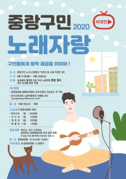 구는 오는 25일(금)까지 ‘2020 중랑구민 노래자랑’ 참여희망자를 접수받는다고 밝혔다. 중랑문화원(원장 김태웅)이 주최하는 이번 노래자랑은 코로나19의 지역 확산 방지를 위해 비대면으로 개최되며 중랑구민 또는 중랑구 소재 직장인이면 누구나 참여가능하다.