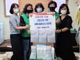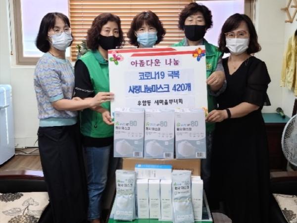 부산시 남구 우암동 새마을부녀회(회장 장순애)는 코로나19 극복을 위한 사랑나눔 마스크(KF80, 식약청 허가제품) 420매(42만원 상당)를 우암동 행정복지센터에 기탁했다. 또한, 마스크 판매업체인 ㈜브레인포커스에서도 취지에 동참해 아토크림 50개(165만원 상당)를 후원했다.