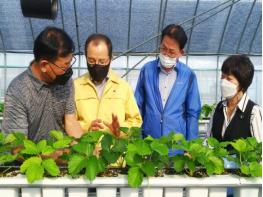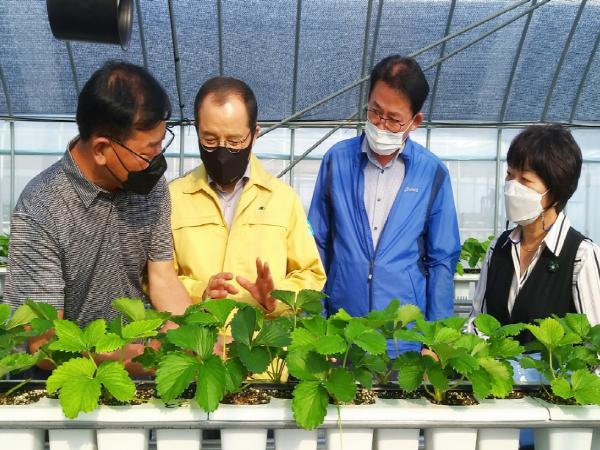 송용섭 원장은 진천군 이월면에 있는 시설딸기 농가(아리랑 농장)를 방문했다. 도내 딸기 소비가 확산되고 면적이 2019년 기준 161ha로 늘어나고 있는바 딸기 농가 숙원사업인 무병화묘 보급시스템 구축을 위한 현장방문이다. 이러한 과제를 해결하고자 올해부터 아리랑 농장에서 원원묘 생산 시범을 시작으로 튼튼한 딸기 종묘 생산체계 기반을 구축해 나가고 있다.