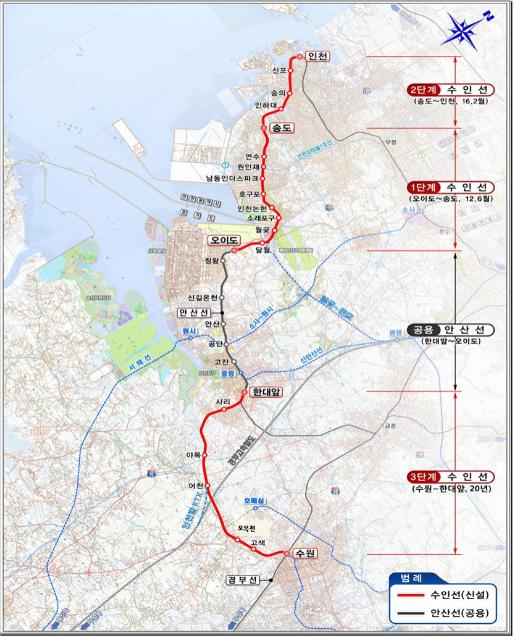 2012년 6월 송도~오이도 구간이 1단계로 개통한 데 이어 2단계 인천~송도 구간이 2016년 2월 순차적으로 운행을 시작했으며, 한대앞~수원 구간 19.9㎞을 마지막으로 전 구간이 완전 개통하게 됐다.