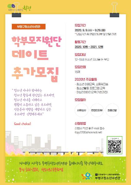 부평구(구청장 차준택)청소년수련관은 10일 지역 내 12~19세 청소년 자녀를 둔 부모를 대상으로 학부모지원단을 모집한다.