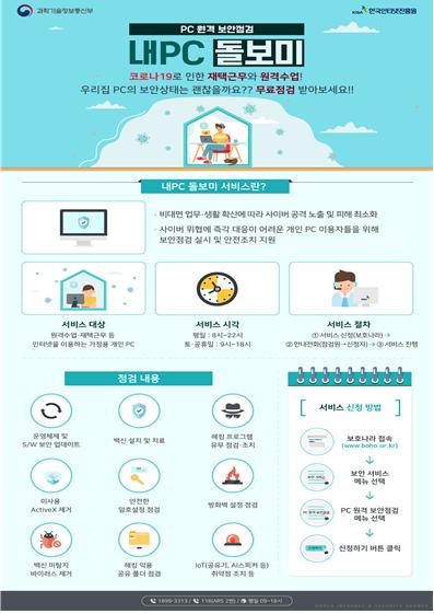 과학기술정보통신부(장관 최기영)는 개인PC를 대상으로 원격으로 무료 보안점검해주는 ‘내PC 돌보미’ 서비스를 본격 실시한다고 밝혔다.