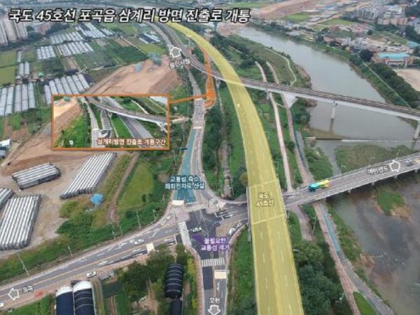 용인시는 교통정체 등의 이유로 개통을 연기해왔던 국도 45호선 포곡읍 삼계리 진출로를 9일 오전 10시 개통한다고 밝혔다.