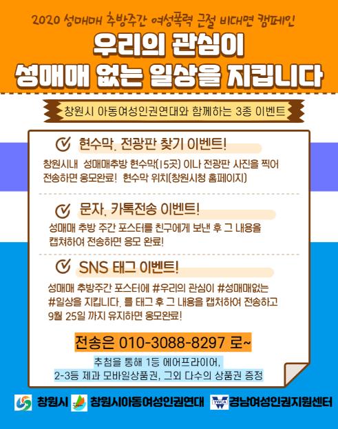 창원시(시장 허성무)는 성매매추방주간(19일~25일)을 맞아 14일부터 25일까지 성매매근절을 위한 비대면 캠페인을 실시한다고 10일 밝혔다.