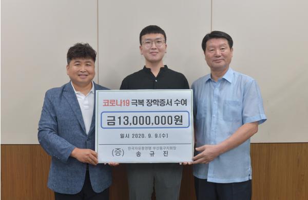 한국자유총연맹 부산동구지회 지회장 송규진은 지난 9일 회원 자녀 및 각동 기초수급자 가정 중 장학생을 추천받아 그중 26명을 선별해 코로나19 극복 장학금 50만 원씩 총1,300만 원을 전달했다.