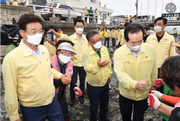9일 울릉도 태풍피해 현장을 방문한 정세균 총리는“이철우 도지사가 중대본회의에서 울릉도 태풍피해 현장을 직접 방문해 정부차원의 대 책을 세워 달라는 간곡한 요청이 있어 오게 되었다”며 “현장에 직접 와 보니 생각보다 피해가 크다. 주민분들 걱정 컸을 것이다. 공공시설, 사유시설 피해 입어서 공직자를 비롯한 주민들께 위로의 말씀을 드린다”고 주민들을 위로했다.