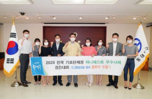한편 구는 지난 2011년 매니페스토 우수사례 경진대회에서 공약이행분야 우수상 수상을 시작으로, 2015년 청렴분야 최우수상, 2016년 주민소통 분야 최우수상, 2017년 지역문화 활성화 분야 우수상, 2019년 지역문화 활성화 분야 우수상, 2020년 초고령화 대응 분야 최우수상에 이르기까지 5년 연속 수상을 이어오고 있다.(2014년, 2018년 매니페스토 우수사례 경진대회 미개최)