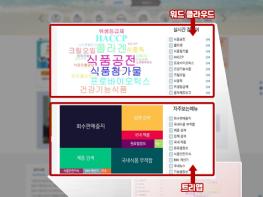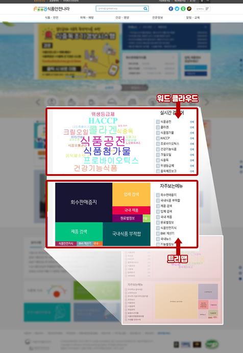 이번 ‘시각화서비스’는 식품안전나라에서 많이 찾는 핵심 검색어와 메뉴의 빈도수를 크기로 표현하는 워드 클라우드(Word cloud)와 트리맵(Treemap)을 제공하고 있으며, 많이 노출되는 단어와 메뉴가 크기로 표시되기 때문에 관심 정보를 한눈에 파악할 수 있다는 장점이 있다.