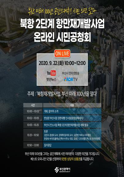 한편, 온라인 시민공청회는 오는 22일 오전 10시부터 ‘북항재개발사업, 부산 미래 100년을 열다’라는 주제로 부산시 공식 유튜브채널 ‘붓싼뉴스’에서 비대면으로 개최될 예정이다. 특히 이는 포스트 코로나 시대에 맞춤형 시민참여 정책개발의 모델로 비대면에 기반한 시민 소통의 장이 될 전망이다. 온라인 공청회는 시민참여자 사전 모집 없이 관심 있는 시민 누구나 당일 실시간으로 참여할 수 있다. 유튜브 댓글로 의견을 제시할 수 있으며 실시간으로 전화를 연결해 패널들에게 질문하고 의견도 들을 수 있다.