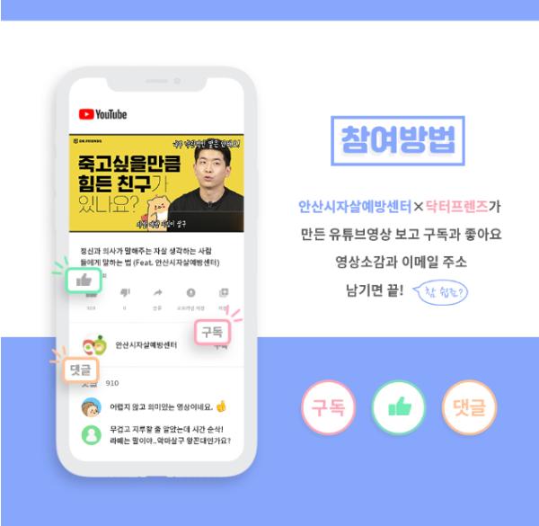 유튜브 영상은 10일부터 닥터프렌즈와 안산시자살예방센터 유튜브 채널을 통해 시청할 수 있으며, 시청 후 안산시자살예방센터 유튜브 채널에 댓글로 소감을 남기면 선물을 증정하는 이벤트에 참여할 수 있다.