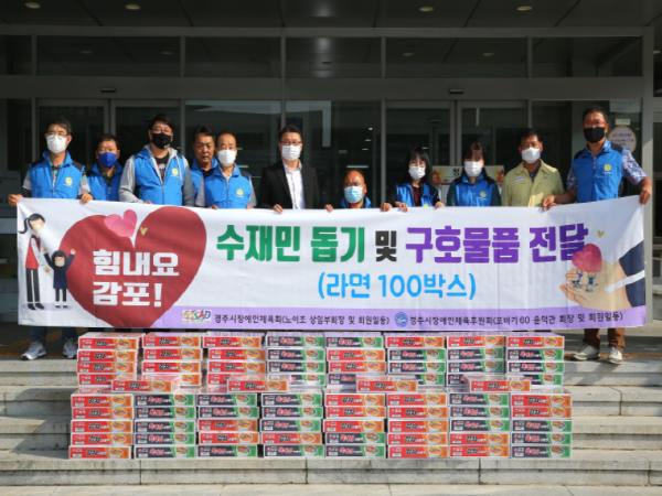경주시장애인체육회(상임부회장 노이조)와 후원회(또바기60, 회장 윤덕관)는 10일 경주시청을 방문해 태풍 피해 주민 지원을 위한 컵라면 100상자를 기탁했다.