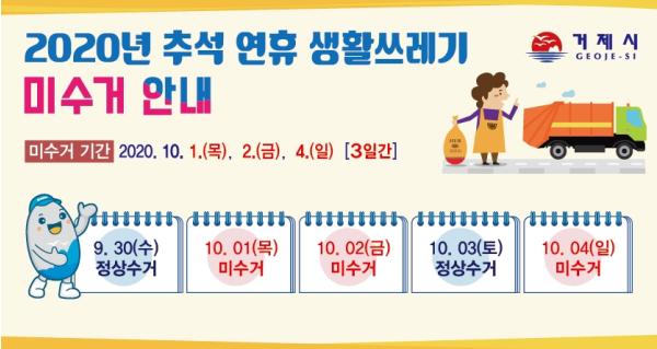 거제시(변광용 시장)는 추석 연휴기간 고향을 찾는 귀성객과 시민들에게 쾌적한 생활환경을 제공하기 위하여 ‘추석 연휴 생활폐기물 관리 대책’을 수립해 추진한다고 밝혔다.