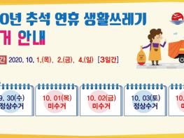연휴 기간인 30일부터 10월 4일까지는 청소대책상황실을 운영하여 폐기물 관련 불편사항 및 민원을 처리하고 수거업체 휴무일에는 재래시장과 도심지 취약지역에 기동 수거반을 투입하여 민원발생이 예상되는 지역에 우선적으로 생활폐기물을 수거한다.