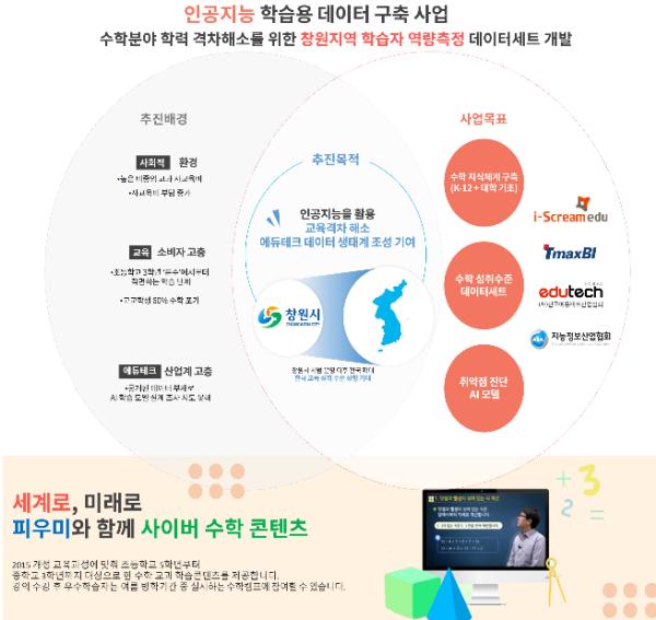 이번 공모 사업에서 시는 국내 최고의 온라인 학습분야 전문기업 및 기관인 경남대학교, ㈜아이스크림에듀, ㈜티맥스BI, 사)에듀테크산업협회, 사)지능정보산업협회와 컨소시엄을 구성하고, ‘수학분야 학력격차 해소를 위한 창원지역 학습자 역량측정 데이터 세트 구축’사업을 제안하여 선정됐으며, 사업비 23억원을 전액 국비로 지원받는다.