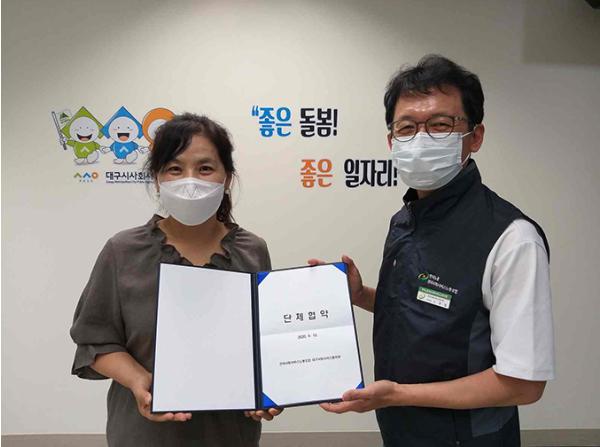 김영화 대구시사회서비스원 대표이사는 “노사 간 깊은 신뢰와 이해를 바탕으로 대구시사회서비스원의 첫 단체협약이 체결된 만큼 이를 성실히 이행하도록 노력하겠다”며 “노사간 협력을 통해 ‘좋은 돌봄, 좋은 일자리’를 만드는데 최선을 다하겠다”고 말했다.