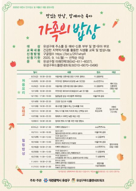 프로그램은 ▲예비?신혼부부를 대상으로 요리를 통해 가족 간 역할에 대한 인식을 개선하는 ‘처음요리’ ▲임신부의 영양을 생각한 건강밥상 교육 ‘맛태교 교실’ ▲육아에 지친 가족들을 위한 ‘힐링밥상’ 3개 과정이며, 9월 25일부터 11월 11일까지 총 19회 온·오프라인으로 진행된다.
