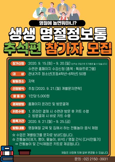 ‘생생 명절정보통-추석편’은 우리나라의 대표적인 명절인 추석을 맞이하여 추석의 유래와 풍속 등에 대한 온라인 교육을 진행하고, 전통놀이와 명절 간식 만들기 등을 체험하는 활동으로 진행된다. 관내 거주 초등학교 4학년에서 6학년까지 50명의 참가자를 모집한다.