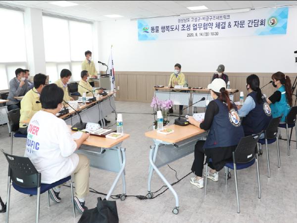 고성군(군수 백두현)은 9월 14일 오전 10시 30분 고성읍 덕선리 소재 귀농지원센터에서 동물보호센터 운영에 필요한 자문과 동물 행복도시 조성에 따른 상호 협력을 위해 비영리사단법인 비글구조네트워크와 업무협약을 체결했다.