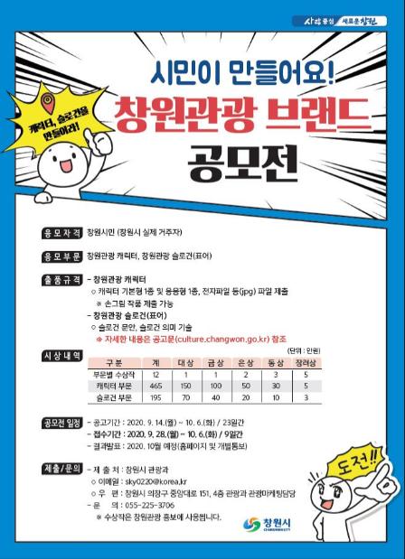 황규종 창원시 문화체육관광국장은 "시민참여형 공모인 만큼 많은 시민이 참여할 수 있도록 캐릭터 부문은 손그림도 접수가 가능하게끔 문턱을 낮췄다“며 "창원관광 콘텐츠와 비전을 잘 표현할 수 있는 재치 있는 아이디어를 가진 시민분들의 많은 관심과 참여를 부탁드린다"고 말했다.
