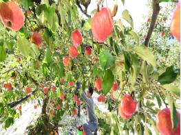 추석을 보름 정도 앞둔 14일 덕유산 자락인 경남 거창군 고제면 봉계리 땀내기 농원 하완기(48세)씨 사과밭에서 하씨의 아들이 긴 장마와 3번의 태풍을 이기고 빨갛게 잘 영근 홍로사과를 수확하고 있다.
