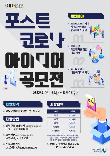공모분야는 포스트코로나 시대를 대비한 비대면 공공서비스 정책을 비롯해 주민생활에 필요한 제안 등이며, 심사를 통해 선정된 우수 아이디어는 강남구 온택트 공공서비스 정책으로 추진된다.