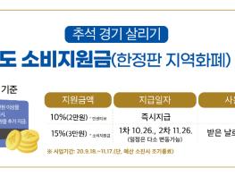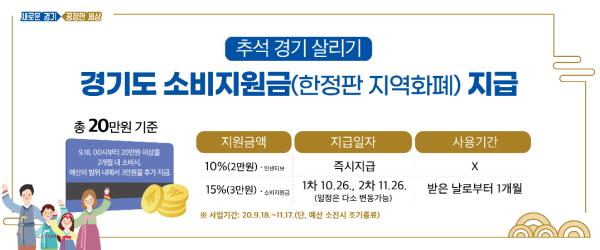 경기지역화폐 충전금액의 10%인 기본 인센티브에 더해 오는 9월 18일부터 11월 17일까지(2개월내) 소비금액 20만원에 한정해 15%에 해당하는 3만원의 한정판 지역화폐를 추가 지급한다.