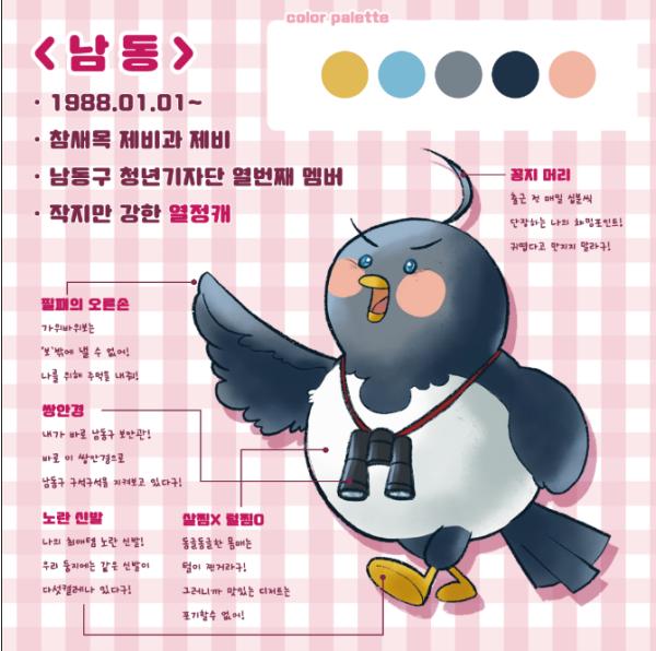남동구 상징물인 제비를 캐릭터화한 ‘남동’은 청년기자단의 열 번째 멤버로, SNS를 통해 청년기자단의 활동과 남동구의 명소를 소개한다.