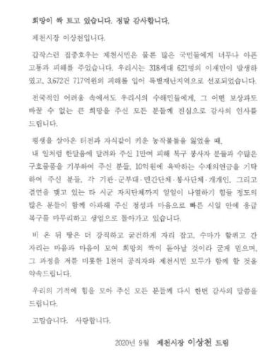 이상천 시장은 서한문을 통해 "전국적인 어려움 속에서도 그 어떤 보상과도 바꿀 수 없는 큰 희망을 주신 모든 분들께 진심으로 감사의 인사를 드린다."며, "평생을 살아온 터전과 자식같이 키운 농작물들을 잃었을 때 같이 아파해주신 많은 분들의 정성과 마음으로 응급복구를 마무리하고 수해민들이 생업으로 돌아가고 있다, "고 말했다.