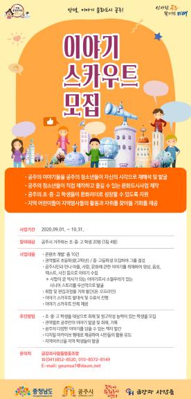 공주시(시장 김정섭)는 지역 청소년들이 공주의 이야기를 발굴할 수 있도록 지원하고 청소년들이 꿈꾸는 문화도시의 기반을 조성하기 위해 ‘이야기 스카우트’ 사업을 추진한다.