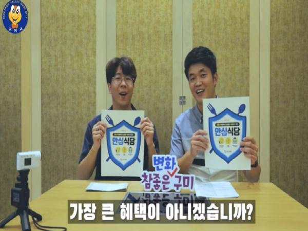 이와 관련하여 시에서는 영업자들의 자율적 동참을 유도하고 시민께 널리 전파코자 구미시 홍보남과 함께 유튜브 동영상을 제작하였으며, 온라인에서 손쉽게 “안심식당 지정신청”을 하는 방법도 포함하고 있어 시민들이 유용하게 활용할 것으로 기대된다.