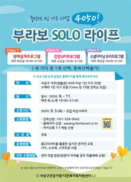 부산 사상구건강가정·다문화가족지원센터(센터장 김진현)는 1인 가구의 사회적 관계망 형성 및 삶의 질 향상을 위해 사상구 관내 중장년층을(40세~64세) 대상으로 1인 가구 지원사업‘4050! 부라보 SOLO라이프’를 실시한다.