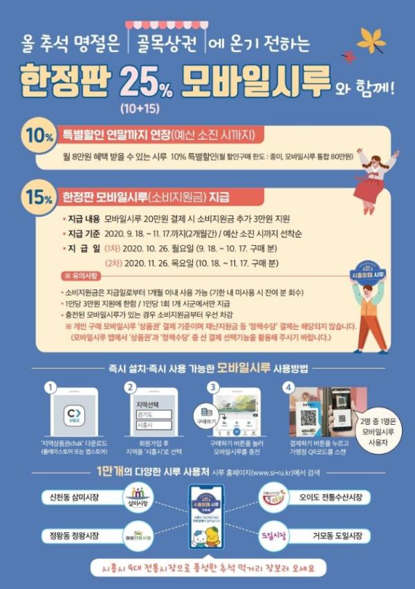 코로나19로 골목경제 침체가 장기화되는 가운데 추석경기 활성화를 위해 시흥시 지역화폐 모바일시루 사용자를 대상으로 소비지원금 3만 시루를 지원한다.