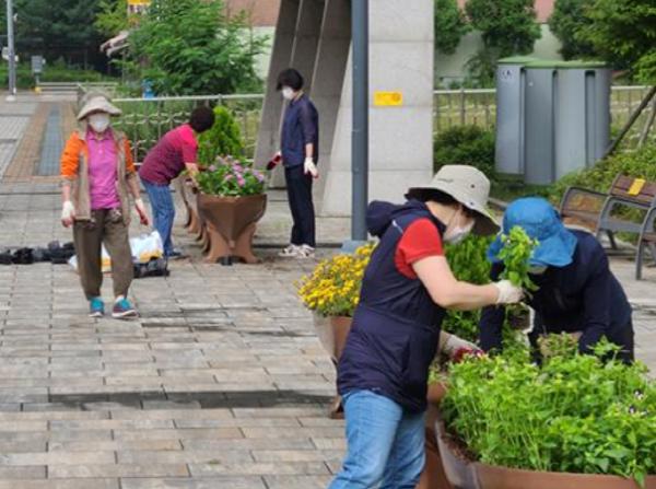 이날 새마을부녀회, 희망일자리 근로자, 동 직원 등 10여명은 가로화단에 국화, 일일초, 사루비아 등을 심고 가로등에 버베나, 웨이브페츄니아, 아이포메아 등의 화분을 걸었다.
