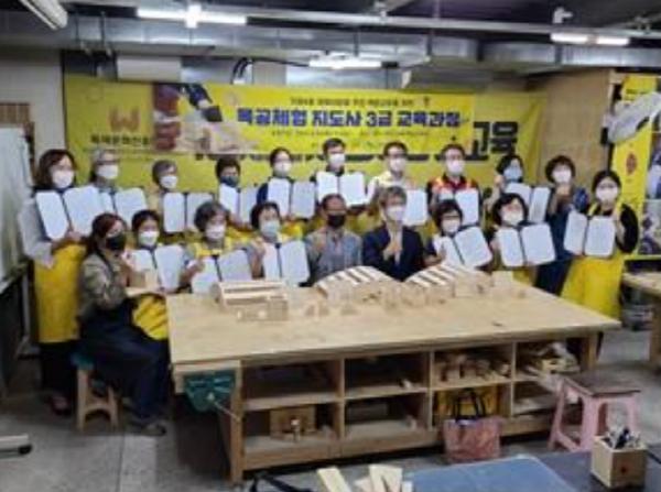 주민들의 목공체험지도사 3급 자격증 취득을 목표로 달려온 이번 교육을 통해 응시생 16명이 전원 합격했다.