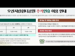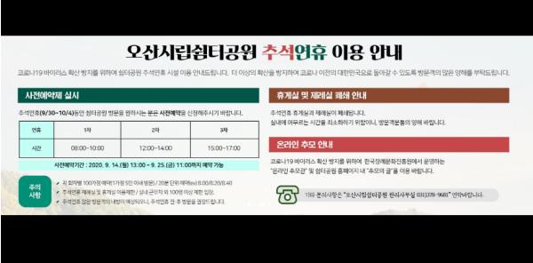 오산시시설관리공단(이사장 이희석)에서 운영하는 봉안시설인 ‘쉼터공원’이 추석 연휴기간 동안 코로나19 확산방지를 위해 사전예약제를 실시하고, 온라인 추모관을 병행 운영한다.