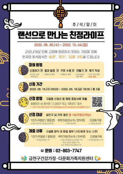 참여를 원하는 주민은 금천구건강가정·다문화가족지원센터 홈페이지에 게재되어 있는 구글링크 및 QR코드를 통해 신청이 가능하다. 주민등록등본, 가족관계증명서 등 구비서류를 함께 첨부해야하며, 파일첨부가 완료된 사람에 한해 선착순으로 한상차림 키트를 각 가정으로 배송할 예정이다.