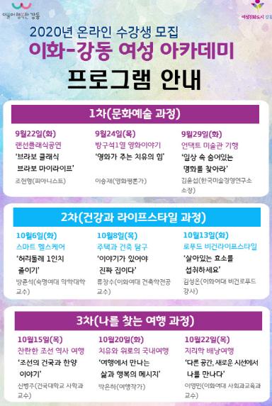 구 관계자는 “이번 이화-강동 여성아카데미는 코로나 시대에 배움과 소통의 기회를 제공하기 위해 온라인으로 마련했다”며 “코로나로 지친 몸과 마음을 치유할 수 있는 계기가 되길 바란다”고 전했다.