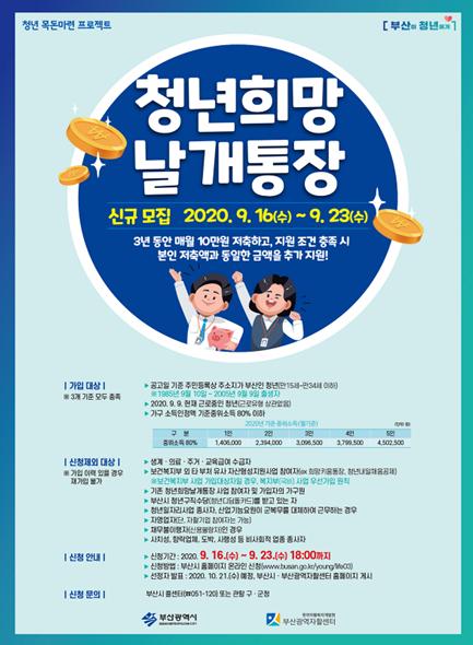부산시는 내일(16일)부터 오는 23일까지 청년희망날개통장 신규가입자 650명을 모집해 3년간 지원할 계획이다.