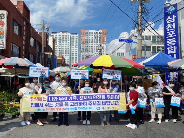 사천시보건소는 추석 명절을 앞두고 귀성객 등 유동인구가 많을 것으로 예상되는 터미널, 전통시장 등 다중이용시설에 대해 방역대책을 강화하고 14일부터 15일까지 양일간 사천읍시장, 삼천포종합시장 등에서 코로나19 예방 캠페인을 실시하였다.