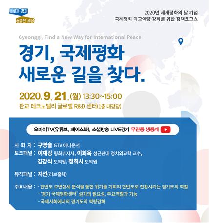 9.21 세계평화의 날을 기념해 경기도의 국제평화 외교역량 강화 방안을 모색해보는 정책토크쇼가 오는 21일 오후 1시 30분부터 판교 테크노밸리 글로벌 R&D센터에서 개최된다.