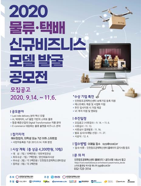 인천창조경제혁신센터와 한진이 공동 주관하고, 국토교통부가 후원하는「2020 제6회 스마트물류 창업공모전 (2020물류·택배 신규 비즈니스 모델 발굴 공모전)」의 모집이 9월 14일부터 시작됐다.