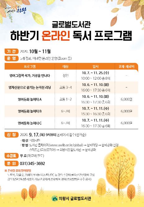 의왕시 글로벌도서관은 코로나19로 현장교육 참여가 어려운 시민들을 위해 영어독서와 관련한 배움의 기회를 제공하고자 가정에서 온라인으로 참여할 수 있는 영어독서강좌를 오는 10월 6일부터 운영한다고 밝혔다.